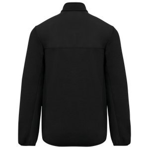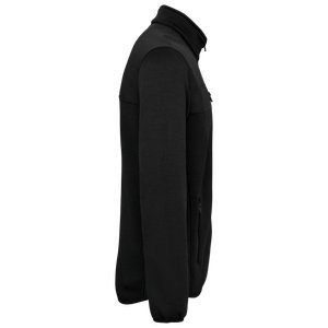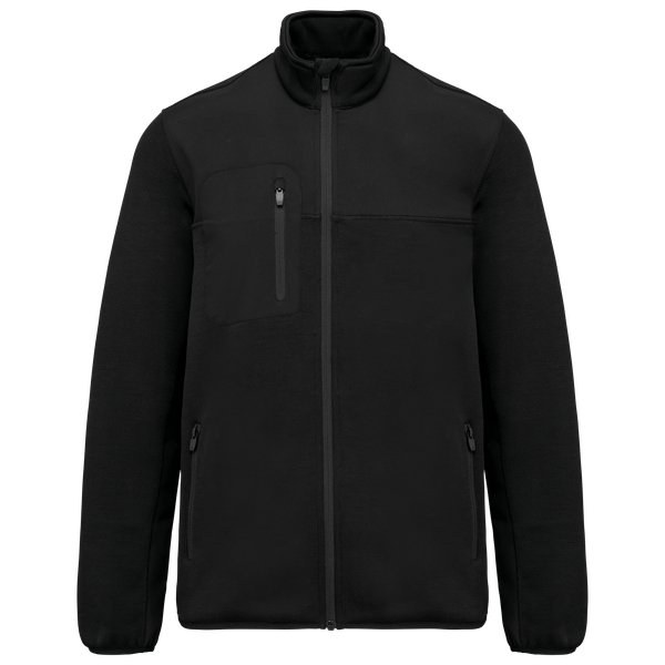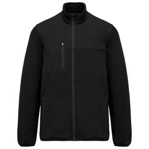 Contrasting 2-layer 100% polyester softshell inserts with water-repellent treatment on the upper body, front and back, sides, and underarms.
